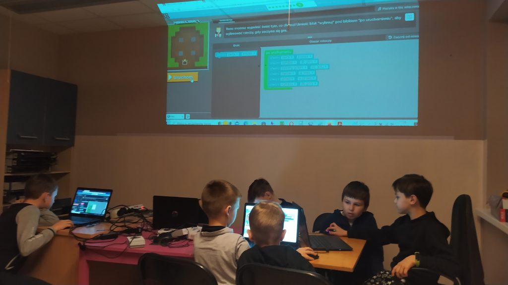 Kolejne zajęcia z informatyki-robotyki to kolejne wyzwanie. Młodsza grupa poprzez zabawę w rozwiązywanie problemów bohaterów gry Minecraft za pomocą kodu obrazkowego poznawała podstawy kodowania.